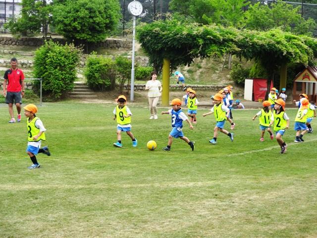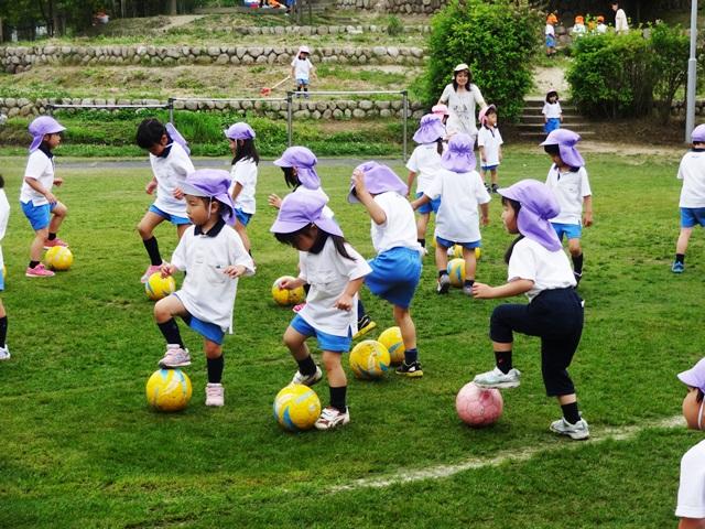 最初に”ボールタッチ”前後・左右と足でボールを触ります。サッカー選手のようにはいきませんが、気持ちは選手になったつもり…一生懸命挑んでいます。うまくできると、M先生のポケットから”グリーンカード”が出てきます。「ナイス!」「うまいよ!」「いいね!」みんなこのカードが励みとなり頑張るのです。