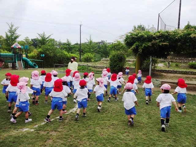 みんなが目をつむって待っている間に先生が隠れます。笛の合図で先生を探し、走っていきます。楽しみながらの準備体操です。