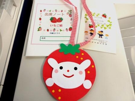 点呼をして、一人一人に手づくりの動物のペンダントをかけてあげました。そして、幼稚園のマスコットのミミちゃんが「いちご組みはとっても楽しいよ。元気いっぱい笑顔いっぱいで遊ぼうね」とメッセージを贈りました。