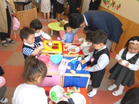 式後、保育室で早速遊び出す子どもたち、新しく用意したキッチンセットで、ごちそうをつくったり、食器を洗ったり、小さなパパ・ママを楽しんでいました。