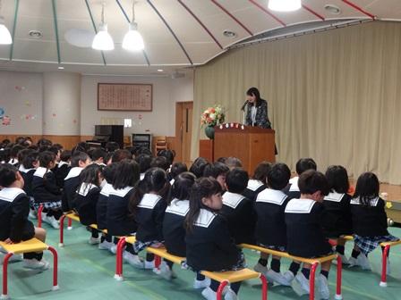 始業式には、保護者の皆様にも列席していただきました。気分整理のためみんなで”むすんで開いて”の手遊びをしました。保護者の皆様にも一緒にしていただきました。少し照れながらも童心にかえって楽しそうにして下さり、緊張の糸がほぐれ和やかな雰囲気になりました。