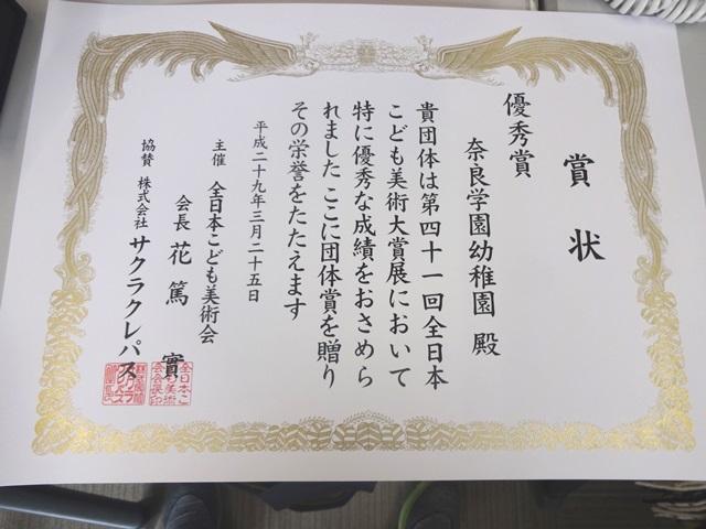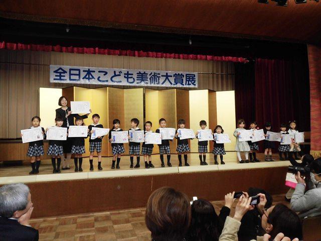 特選の子は、表彰式に参加し、主催者代表の方から表彰状をいただきました。舞台の上でちょっぴりドキドキしながらも立派に受け取っていました。賞を頂く事だけが目的ではありませんが、受賞したという経験は、一人一人の子どもたちの自信と励みとなったことだと思います。