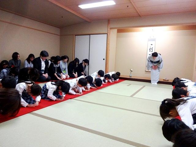 先生から保護者の方に、掛け軸やお花の説明がありました。今日のお軸は”一期一会”です。「出会いを大切にしましょうと言う意味です。今日は、始めてであり最後の参観でもあります。だからこそこの姿をよく見て頂きたい。上手に出来ていたことを褒めてあげて下さい。一時一時の出会いを大切に。お軸だけれどお人が座っていらっしゃると思って下さい。だからお辞儀をするのですよ」と教えて下さいました。
