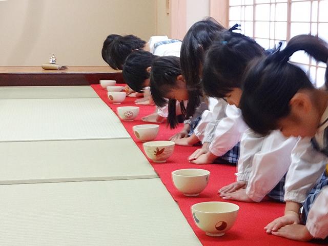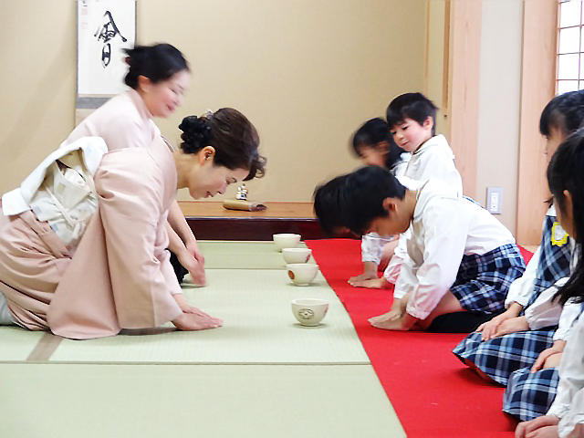 和室では、先に入室されたお母様、お父様が待って下さっています。正座して、おじぎをした子どもたちは、順にお茶室に入場します。「左足をたてて右・左で入りますよ」足の運び方も上手になりました。緋毛氈にきちんと並ぶことができました。