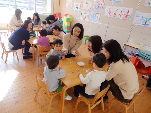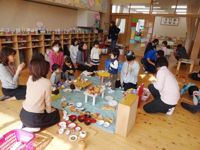 登園してきた親子は、赤組・青組・黄組の保育室に分かれて入ります。保育室で待っていた先生が「おはようございます」と子どもたちや保護者の皆様を笑顔で迎えます。入室した子どもたちは、ままごとやブロック、汽車の玩具など、好きな遊びを見付けて遊び出しました。お母様・お父様が子どもさんに寄り添い、ごちそうを一緒に食べたり、汽車を走らせたりして素敵な笑顔で関わっておられる姿が印象的でした。