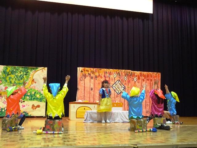 年長5歳児は『白雪姫』 どの子も堂々と動き、大きな声で台詞を言います。役になりきっています。お話の世界にグングン引き込まれながら観ていました。園生活の中でいろいろなことを体験し、できることが1つ1つと増えることで自信をもち、どんなことにも一生懸命に取り組むようになった年長組さんです。すごいよ!