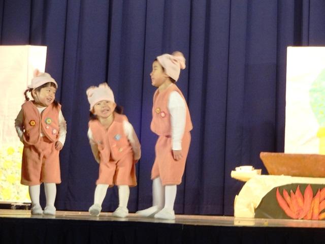 最初は、一番小さい年少3歳児の劇です。大きな舞台の上ですが、登場してくるとご家族の姿をみつけ手を振っています。こちらの心配をよそに結構余裕のある子どもたちでした。無邪気で愛くるしい3歳児の姿に会場のお客様も笑顔がいっぱいでした。