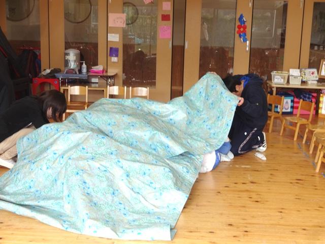 保育室で遊んでいた子は、部屋の中央の安全なところに身を低くして集まり、頭を守ります。園庭で遊んでいた子は建物から離れ安全なところに集まります。