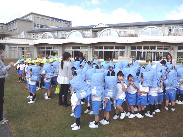 「揺れがおさまりました」の合図で二次避難をします。防災頭巾を被り園庭に整列し、点呼をうけます。