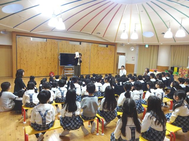 「避難訓練です。地震が起きました。先生の言うことをよく聞いて動きましょう」