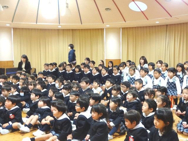 避難訓練の後、遊戯室に集まった子どもたちと今日の訓練の振り返りをしました。まず「しんけん」という文字を見せ、避難訓練はみんなの命を守る訓練だから「しんけん」に取り組まなければならないことを伝えました。みんなの空気が変わりました。「しんけん」な表情で話を聞くことができました。そして、「お・は・し・も」の約束を再度確認し合いました。「おさない」「はしらない」「しゃべらない」「もどらない」みんなよく知っていました。そして、アニメ「さる太郎地震には負けないぞ」を視聴しました。動物村で地震が起きたら…そのときもみんな「しんけん」でした。