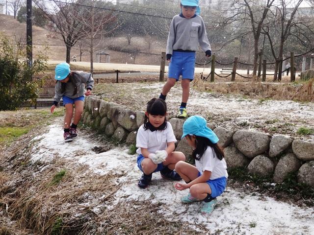 子どもたちは「雪だ~!」と一目散で駆けて行きます。凍って固まった雪ですが子どもたちは「冷た~」「手袋ほしいわ」と言いながらも一生懸命集めていました。私が行くと、背中に何かが当たりました。振り返ると女児がケラケラと笑っています。雪を投げてきたのです。「もっとたくさん積もれば雪合戦ができるのにね」と思いながら、私もそのあたりの雪をかき集めて投げ返しました。
