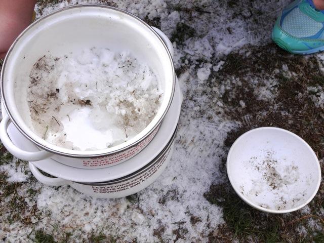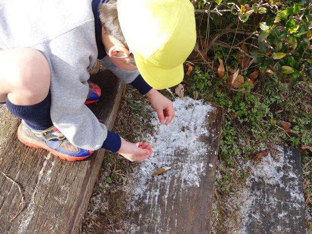 翌朝、登園時に「集めたの♪」「冷た~い」と雪の塊を大事そうに持ってくる子どもの姿がありました。普段見られない冬の贈り物を友達や先生と共有し合いたいと思って持ってきたのでしょう。