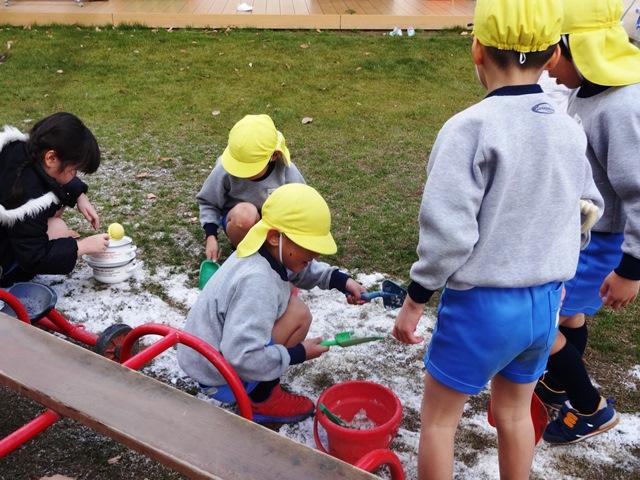 少しの雪でも関わってみたいと心弾ませて遊ぶ子どもたちです。もっとたくさん降って子どもたちにうーんと雪遊びを楽しませてあげたいなと思いました。