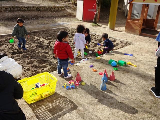 寒くても外遊びが大好きな子どもたちは、園庭の総合遊具で遊んだり、砂場で穴を掘ったり、容器に砂を入れたり出したりして楽しんでいました。外で遊ぶことで風の冷たさを体で感じ、冬は寒いと言う季節を実感していくのです。