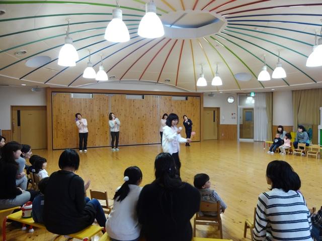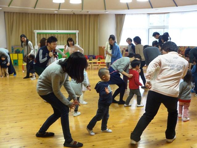 遊戯室に全員集合し、集団遊びを楽しみました。「だるまさんがころんだ」「だるまさんがくっついた」と親子で体を動かしました。この触れ合いが幼児期には大切なのです。お母さんの笑った顔、喜ぶ姿、抱っこしてもらったことは、心の根っこに深く刻まれることでしょう。