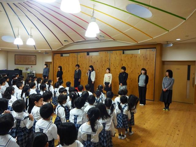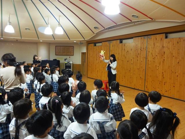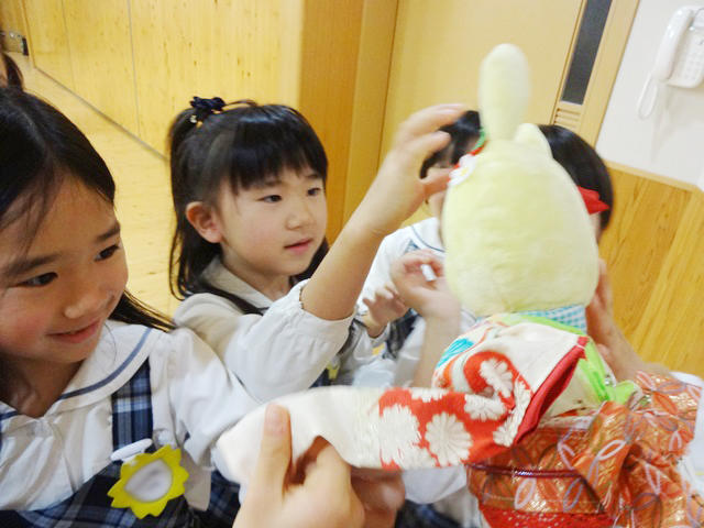 晴れ着を着た、マスコットのミミちゃんが登場すると「可愛い」と大喜び♪洋裁の得意な先生の仕立てです。幼稚園の職員は、それぞれ得意なことがあります。ピアノが好き、ダンスが好き、物作りが得意、運動が好き、書道が得意等…そんな特技を保育に生かしながら、子どもたちの笑顔をもっともっと輝かせたいと思います。