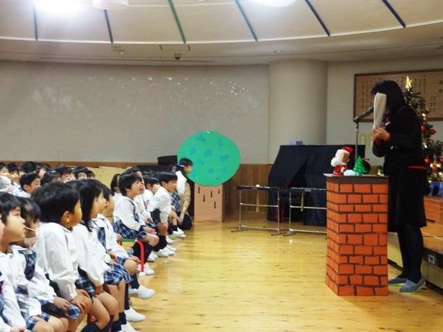 遊戯室に集まった子どもたちにサンタのパペットや手製の紙芝居を使って話をしました。