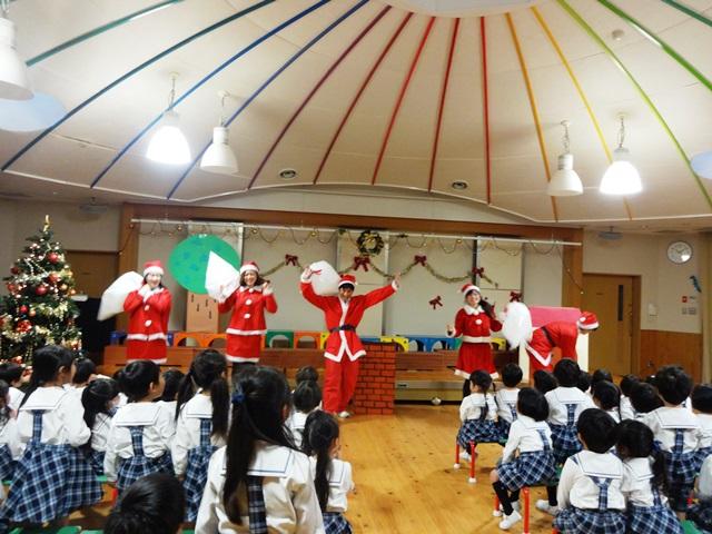 歌を聴きあったり、先生からの出し物”5人のサンタクロース”の寸劇を見たり、ブラックシアターをみながら赤鼻のトナカイを合唱したりしてサンタさんを待ちました。