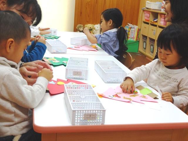 サンタさんが来てくれたら、プレゼントを入れてもらうツリー型のバックも作りました。子どもたちは、ツリーに、サンタ・トナカイ・雪の結晶・ライトなどのシールを貼りました。根気よく集中して作る姿は、真剣そのものでした。