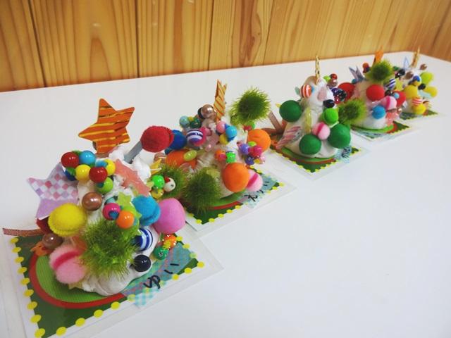 粘土で作ったツリーにいろいろなオーナメントがくっついています。先生が、2歳児でも作りやすいようにと考えて準備したいろいろな飾り物を、粘土に挿して作っていました。