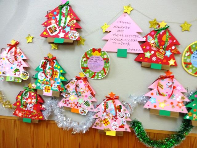 2歳児いちご組では、子どもたちが作った可愛いクリスマスツリーが飾られていました。