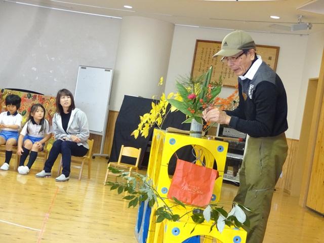 そして、持参した森の贈り物で、門松をつくって下さいました。「どうだい。こうやって、家にあるものを使ってつくれるんだよ。」