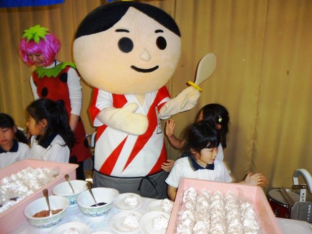 そこへ、紙芝居の中のお米丸くんといちご姫が登場♪「ワァー」と子どもたちは大喜びです。一緒に記念写真を撮ったり触れあったりして楽しい時間を過ごしました。