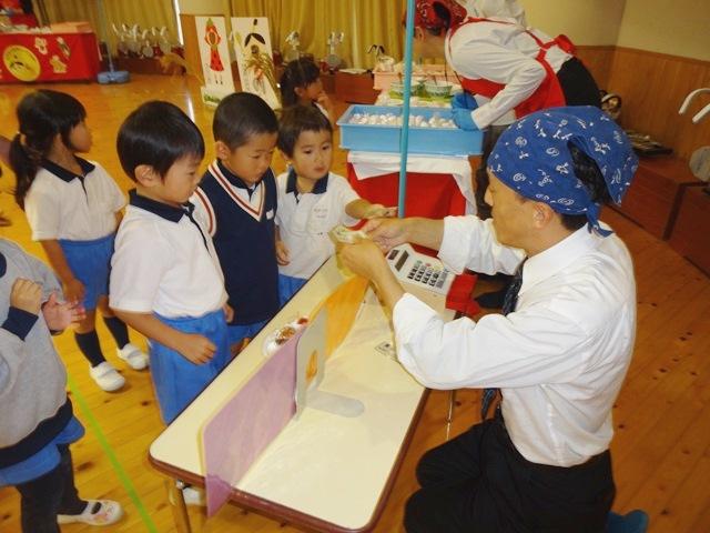 遊戯室に設えられた屋台”おむすびやさん”でおむすびを買います。みんなお米丸マネーをもっています。お店で鮭おむすび1個とふりかけ・梅・ゆかりの3種類の中から好きなおむすびを1個選んで買いました。