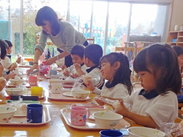 今日の給食は、屋台で買ったおむすび2個と豚汁です。みんな大きな口を開けてパクッとおむすびを頂いていました。「美味しい」「もっと食べたい」