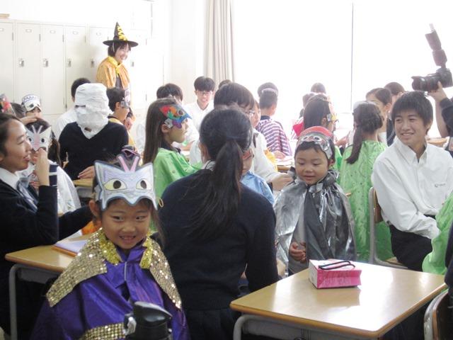 ミミ先生とフィリップ先生と一緒に作ったパンプキンやドラキュラの面と可愛いマントで仮装した子どもたちは、小・中のお兄さん・お姉さんのところにお菓子をもらいに行きました。