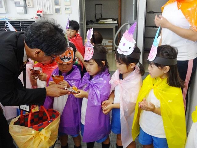 お菓子がもらえることがとっても楽しみな年少組さんです。「Trick or Treet」と大きな声で言って両手を広げて待っていると、教頭先生が「Happy Halloween」と言ってお菓子を手の中に入れて下さいました。