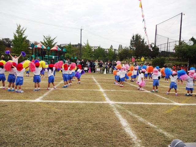赤・黄・桃・青のポンポンを持って踊ります。このダンスが大好きで、自由遊びの場でも楽しそうに踊っていました。だから、当日も自信満々! みんないきいきとダンスしていました。『フレ、フレ~』と手を高く上げて振るところが大好きで大空に元気いっぱいの声が響き渡っていました。