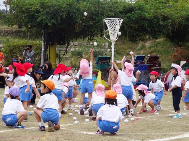 玉入れ競技は、年中児と一緒にしました。ゴールハイめがけて一生懸命投げますが、なかなか入りません。それでも無心に投げる姿が力強くみえました。