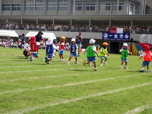 最後のプログラムは、スウェーデンリレーです。幼稚園児から高校生までがバトンを繋ぎます。ピストルの合図で年少児から走ります。「自分の相手にバトンが繋げるかな」とチョッピリ心配しましたが、みんなとっても上手でした。園児から小学生、中学生・高校生とバトンが繋がれます。追い越されたり、追い抜いたり、ハラハラドキドキです。みんな一生懸命。ランナーも応援団も教員も保護者の皆様も心が一つになる素晴らしい時間でした。