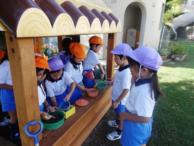 でもこれが3歳児です。売ることよりも作ることの方がずーっと楽しいのです。砂の感触、水を足すとどうなるのか、花や木の実を入れると美味しそうにみえる…等、遊びながらいろんなことを試し、気付き、考えているのです。