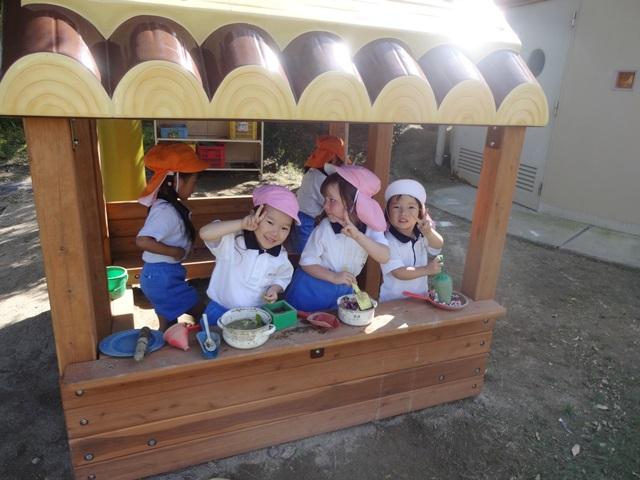 誰もいなくなったハウスに今度は年少児が集まってきました。容器に砂・花・ドングリなどを入れ、ケーキづくりをするKちゃん。「まだできていないからね」と混ぜてこねることがとっても楽しいようでした。Uちゃん・Eちゃんも花や葉・木の実を集めてケーキづくりを楽しんでいました。