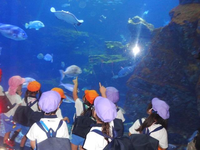 大水槽では、大・小色々な魚が悠々と泳いでいました。その中で銀色に光るイワシの群れは、”スイミー”の絵本のようです。小さなイワシが集まって大きな魚のようになって渦を巻くように泳いでいます。時折、花火のようにパッと離れますが、またすぐに戻ります。それがショーのようでまた美しいのです。