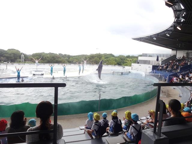 最後は、みんなが楽しみにしていた”イルカパフォーマンス” 京都水族館では”イルカLIVEきいて音(ネ)”ということで観客も共に楽しむ体験型です。会場で一人一人がもらった笛を吹くとイルカの鳴き声のような音が出ます。