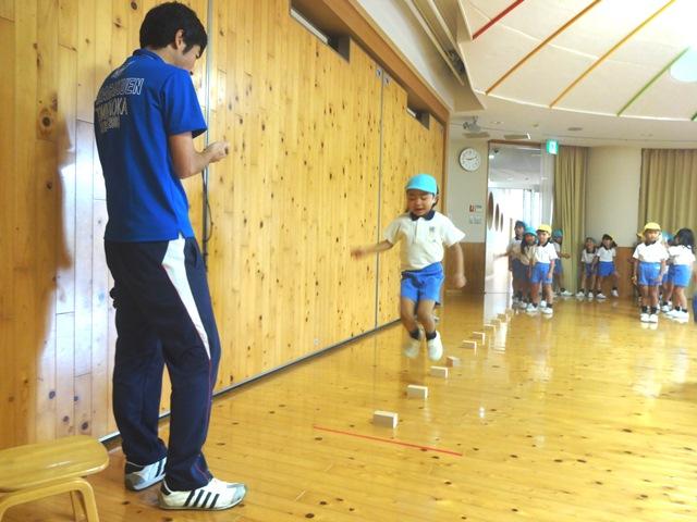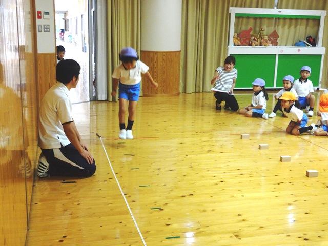 年中・年長児は”運動能力調査”を行いました。25m走・立ち幅跳び・ボール投げ・両足連続跳び越しの4つの測定を行い、走る・跳ぶ・投げるといった基本的な動きに基づく運動能力を測定しました。