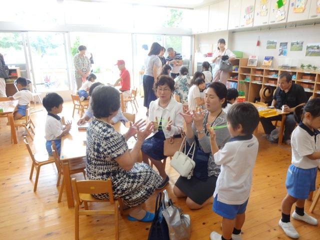 園児のお母さんも園児もおばあちゃんに教えてもらいながら一生懸命挑戦していました。とても微笑ましい光景でした。いろいろなコーナーで遊んでいただきありがとうございました。優しさと温もりに包まれたひとときでした。