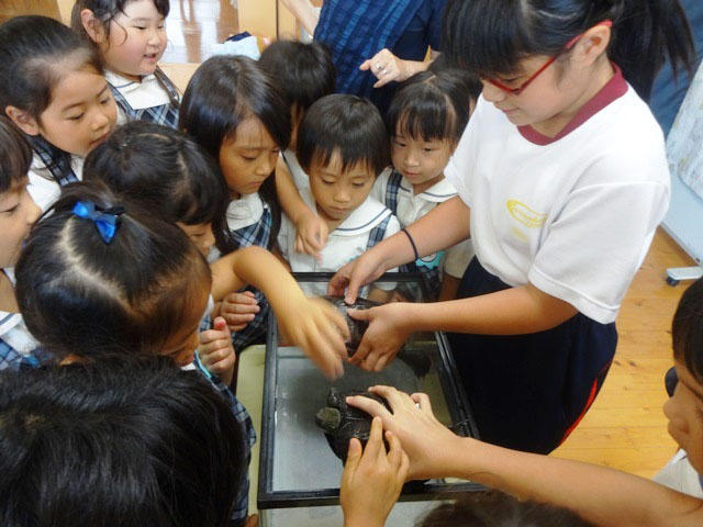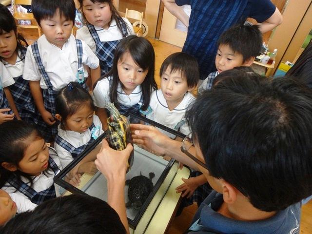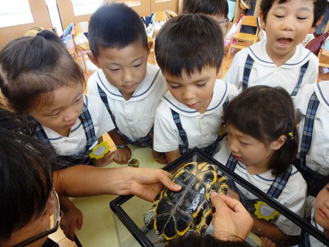 すると空き時間に、飼育係の生徒さんと教室で飼育している亀(オトちゃんとウラちゃん)を連れて再び幼稚園に来て下さいました。