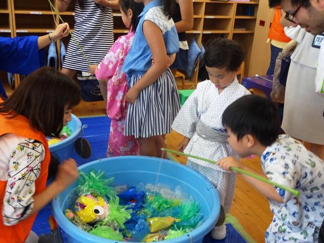 園では、保護者や職員・小学校の先生たちの手作りのゲームや制作コーナーがあり、縁日の夜店の雰囲気が醸し出される中、笑顔いっぱいで楽しむ親子の笑い声が響いていました。