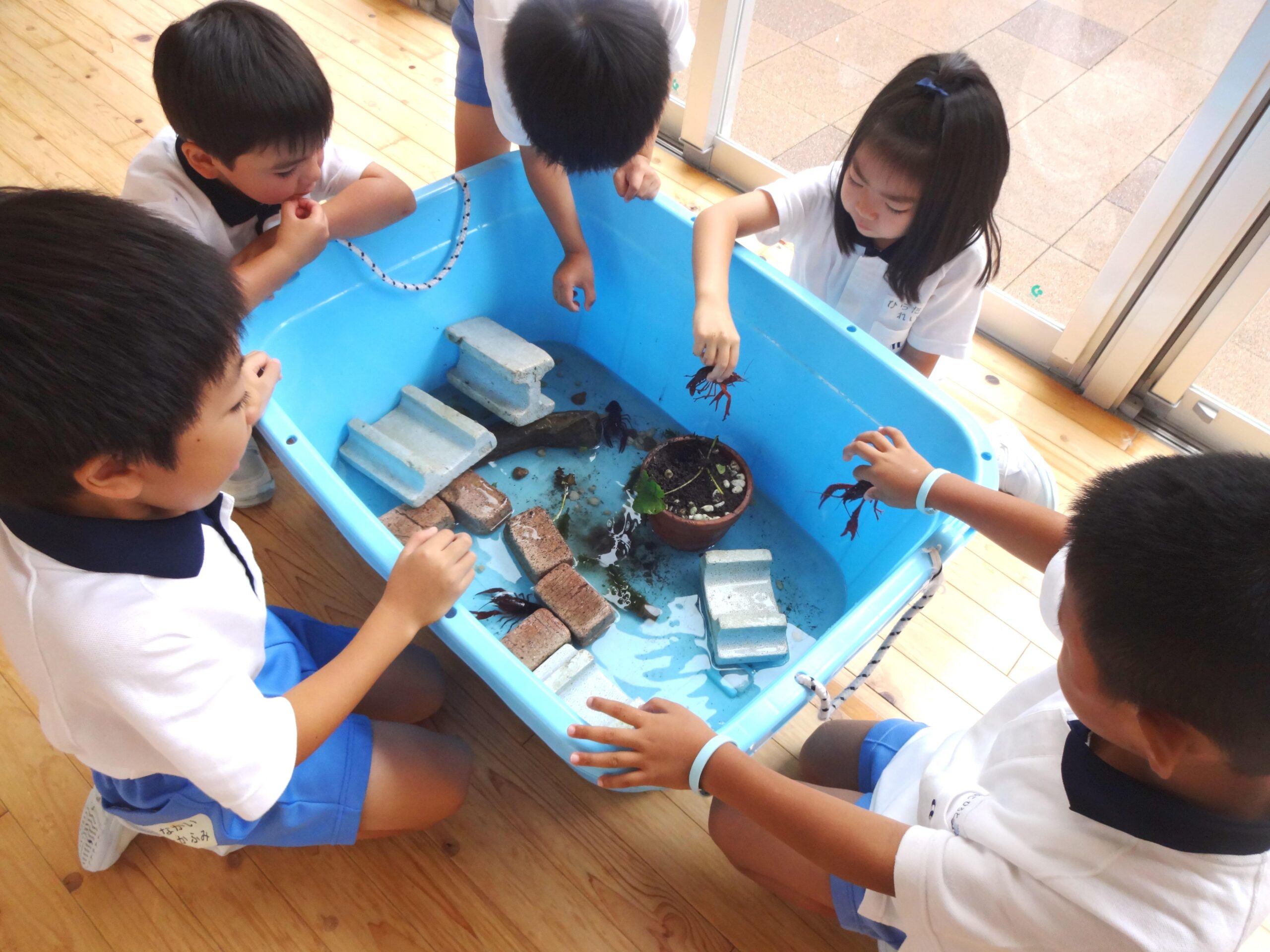 友達や先生に褒めてもらうことで、挑戦欲がフツフツと湧いてくるのでしょう。繰り返し楽しむ姿がみられます。遊びを通して、ザリガニの特徴に気付いていきます。