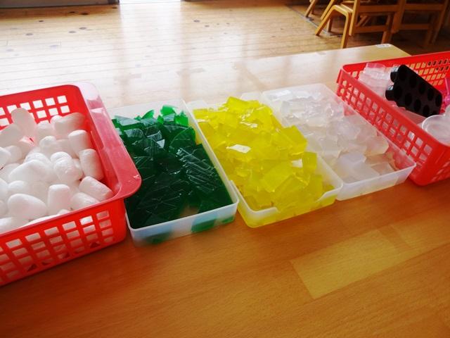 子どもが帰った後、3歳の保育室に、明日の遊びの環境として着色した寒天が準備されていました。