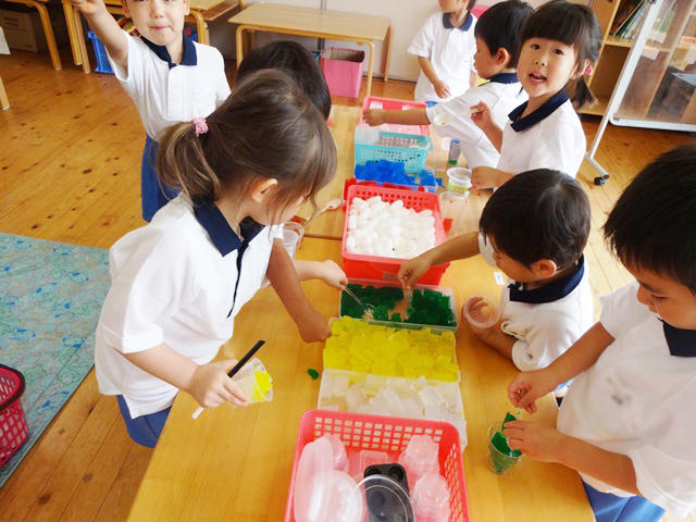 登園してきた子どもたちは興味津々! 「何だろう」「おもしろそう」「冷たーい」「きれい」大騒ぎです。