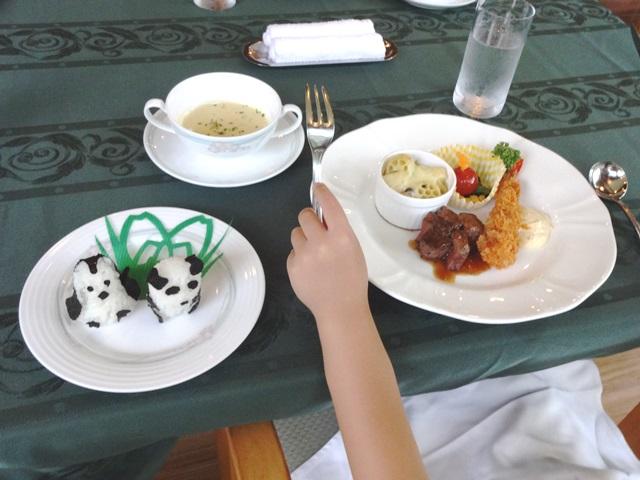 夕食は、ホテルのレストランで、スタッフの方が心を込めて作ってくださった豪華ディナー♪ テーブルマナーを教えて頂き、ナイフとフォークでいただきます。エビフライ・ステーキ・グラタン・サラダ・スープそして、ペンギンとパンダのおにぎり、デザートにジュースとアイスクリーム♪