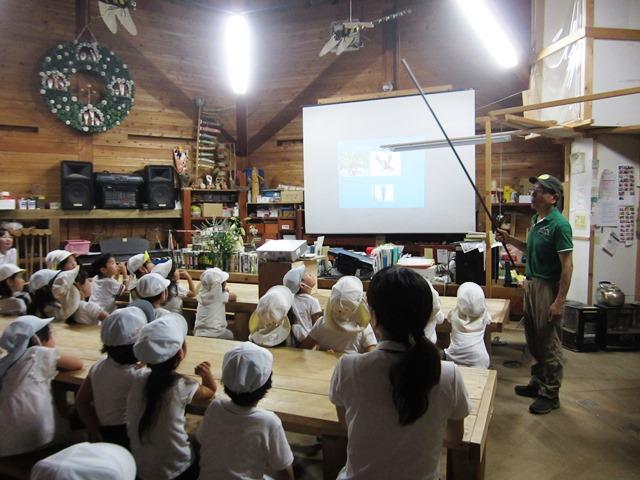 森の工作館の館長さんから蛍についての話を聞き、いよいよ出発です。森の中は真っ暗です。手に持つ懐中電灯の明かりを頼りに進みます。その時「ここからは電気を消して!」と館長さんの声。一斉に電気を消すと…ポッポッと美しい光が舞います。「あっ、蛍!」「きれい」…