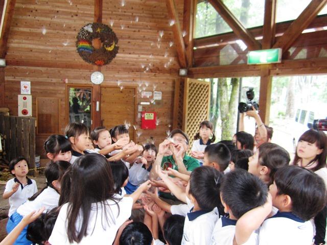 森の工作館に着いた子どもたちは、久保館長さんに迎えられ、早速”ガガイモ”の種飛ばしをしました。タンポポの綿毛のようにフワフワと飛んでいくたくさんの種に大歓声♪