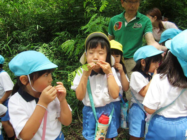 いよいよ、ガイドウォークの出発! 森の散策の始まりです。くねくね道を歩きます。登りと下りの険しい道を久保先生に一生懸命について歩きます。久保先生が1枚の葉っぱをとって「プープー」と鳴らしてくれました。「さぁみんなもならしてごらん。これはニセアカシアの葉っぱだよ。いい音がするだろう」みんなもやってみます。ホッペを膨らませて一生懸命に鳴らします。葉っぱの音楽会が森の中に響きました。